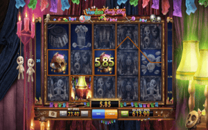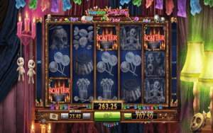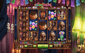 Nguzo za sloti ya Voodoo Candy Shop zimewekwa mbele ya pazia ambapo kuna maonesho ya watu fulani ambayo hufanyika. Kwa kulia utaona taa, wakati upande wa kushoto wa nguzo ni midoli ya voodoo.