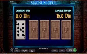 Kama ilivyo kwa sloti nyingine kutoka kwa mtoaji wa Endorphina, sehemu ya Magnum Opus ina mchezo mdogo wa hatari, ambao ni mchezo wa kamari. Baada ya kila mchanganyiko wa kushinda, karata nyekundu inaonekana kwenye jopo la kudhibiti, ambalo unaweza kuingia kupitia hilo kwenye mchezo wa kamari.